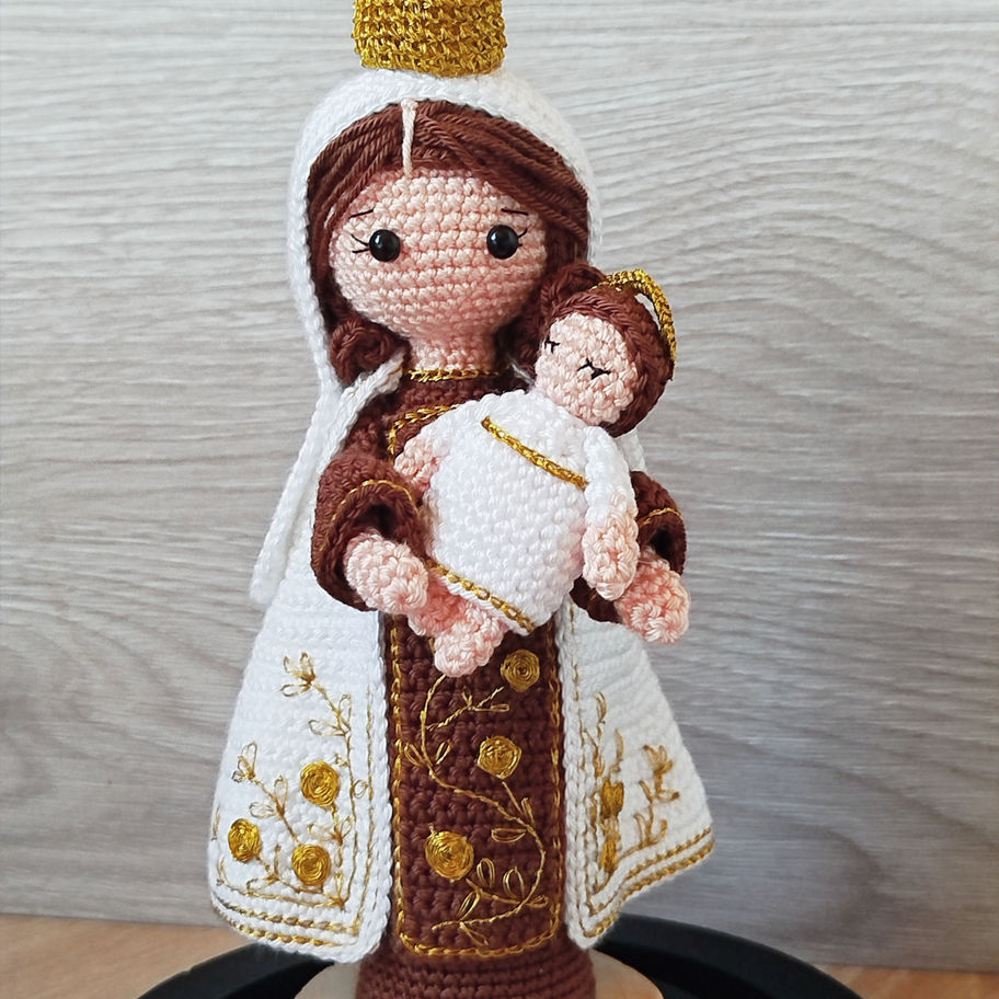Esta obra única, elaborada completamente a mano con la técnica japonesa de amigurumi, captura la esencia de la Virgen del Carmen con todo su amor y devoción. Con su manto bordado a mano en delicado hilo dorado y el Niño Jesús en sus brazos, es un símbolo de fe y esperanza.